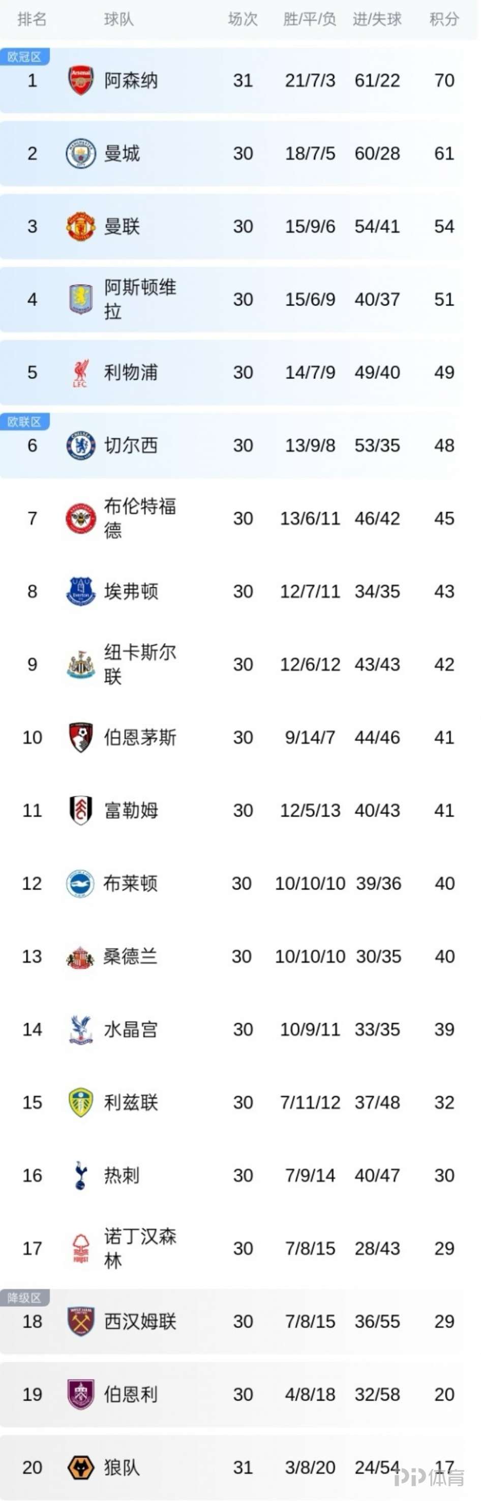 英超积分榜:狼队近3轮2胜1平 距离第17差12分
