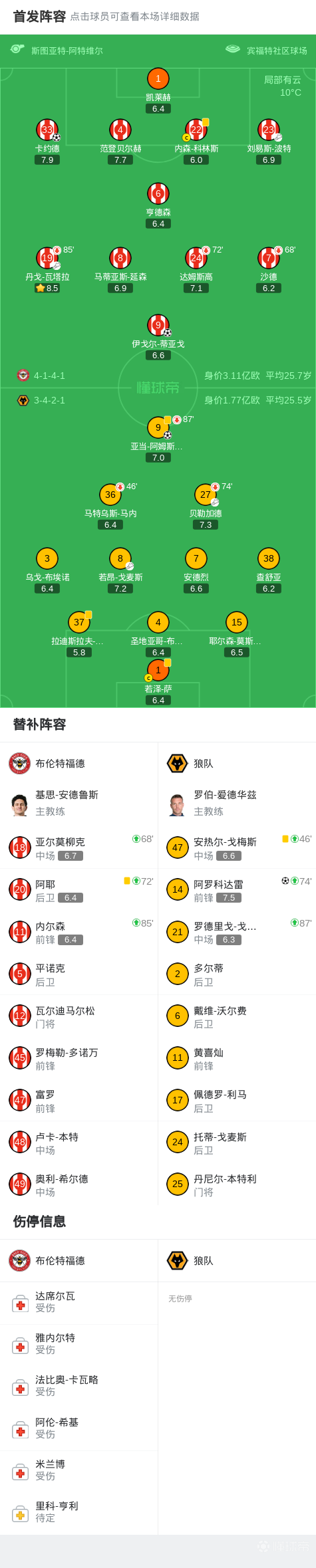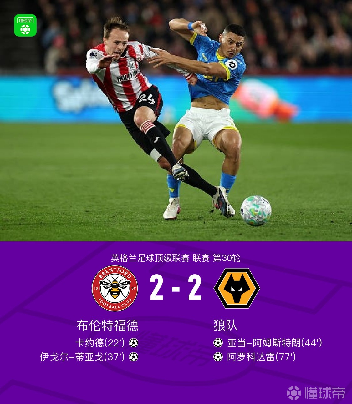 布伦特福德2-2狼队,蒂亚戈破门,阿罗科达雷建功